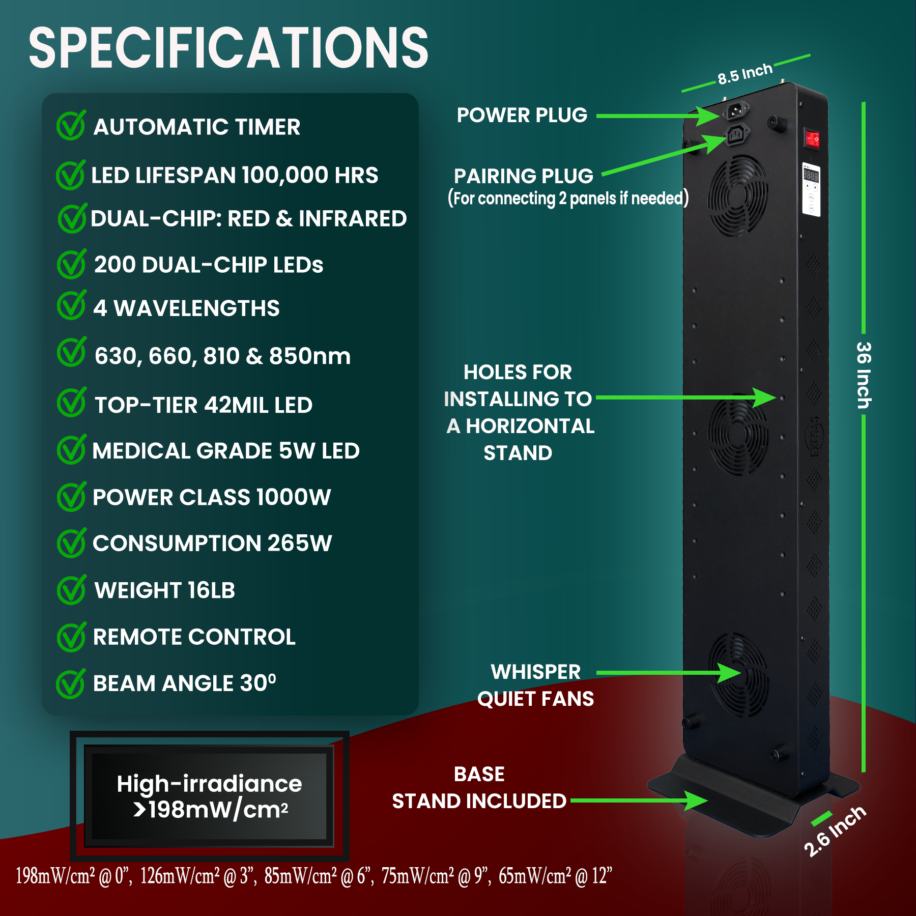 BEST RED-LIGHT DEVICE: Discover the ultimate in LED Red-Light Therapy with our cutting-edge device. Utilizing state-of-the-art technology favored by professional athletes and highly recommended by today's leading doctors & therapists, our Full Body Panel is designed for versatile placement anywhere you desire, comes with a base stand. Engineered with Dual-Chip Medical Grade LEDs, 4 Wavelengths & Automatic Timer; it ensures high-irradiance, no flickering, providing consistent and effective therapy sessions. Remote control included. 200 top-tier 42Mil LEDs, 5W each, Power Class 1000W, Actual Power Consumption 265W, Wavelengths: 630nm 660nm 810nm & 850nm. RED & Infrared lights can be turned on separately or together. High-irradiance >198mW/cm², Beam angle 30 degrees, No EMF. Size: 36"X8.5"X2.6"