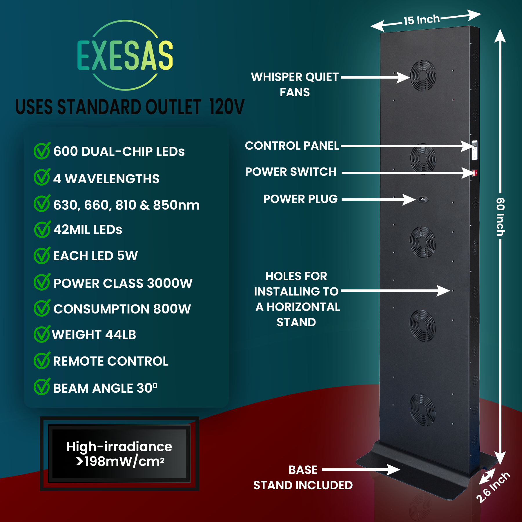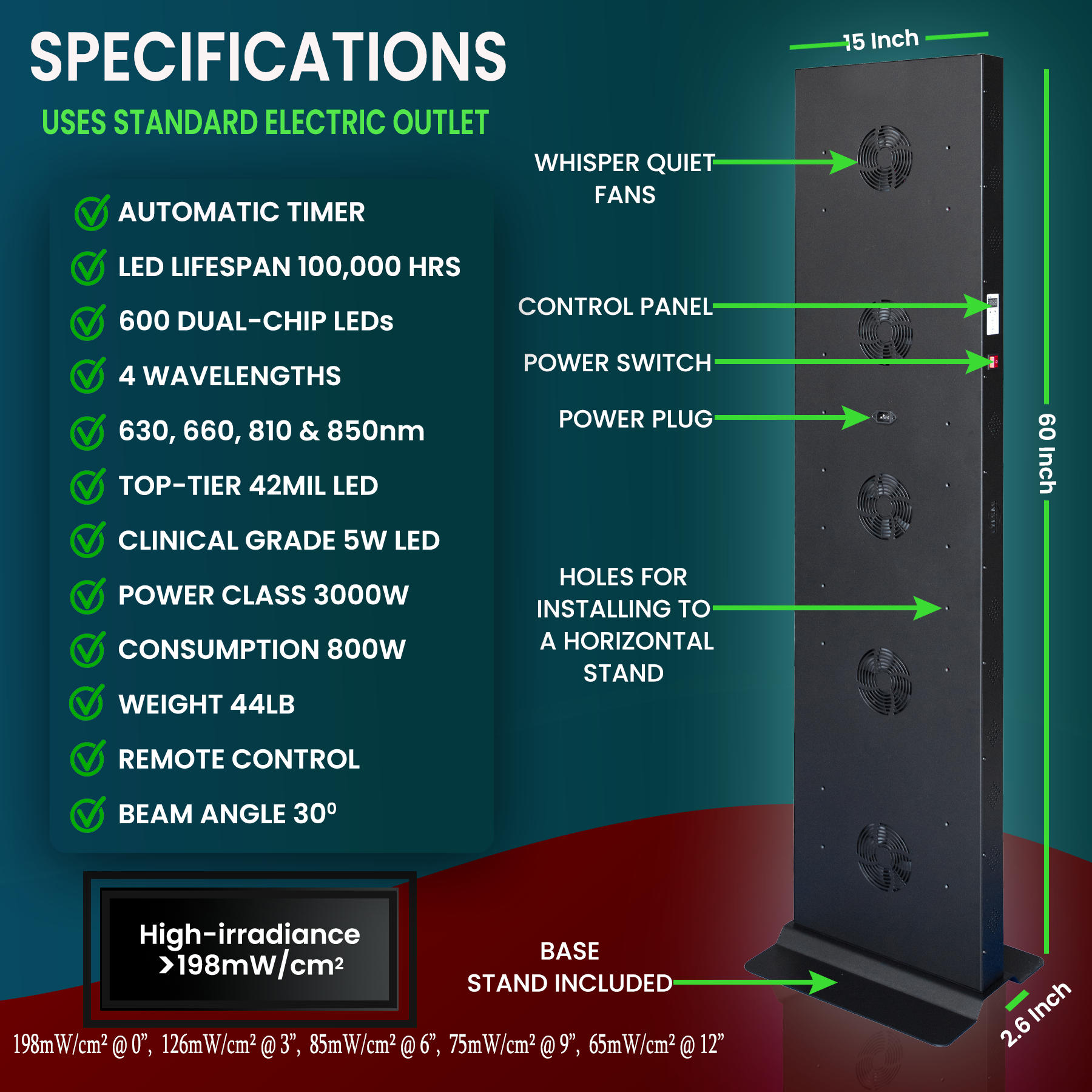 CUTTING EDGE LED DEVICE: Our LED Red-Light therapy utilizes the state-of-the-art technology used by Pro Athletes and recommended by today's leading Therapists. Our Full Body Panel can be placed anywhere. Base stand included. 600 Clinical Grade LEDs, 5W each, Power Class 3000W, Actual Power Consumption 800W, Dual-Chip, 4-Wavelengths: 630nm 660nm 810nm & 850nm, RED & IR lights can be turned on separately or together. High-irradiance >198mW/cm², Beam angle 30 degrees, No EMF, No Flickering. Size: 60"X15"X2.6"
