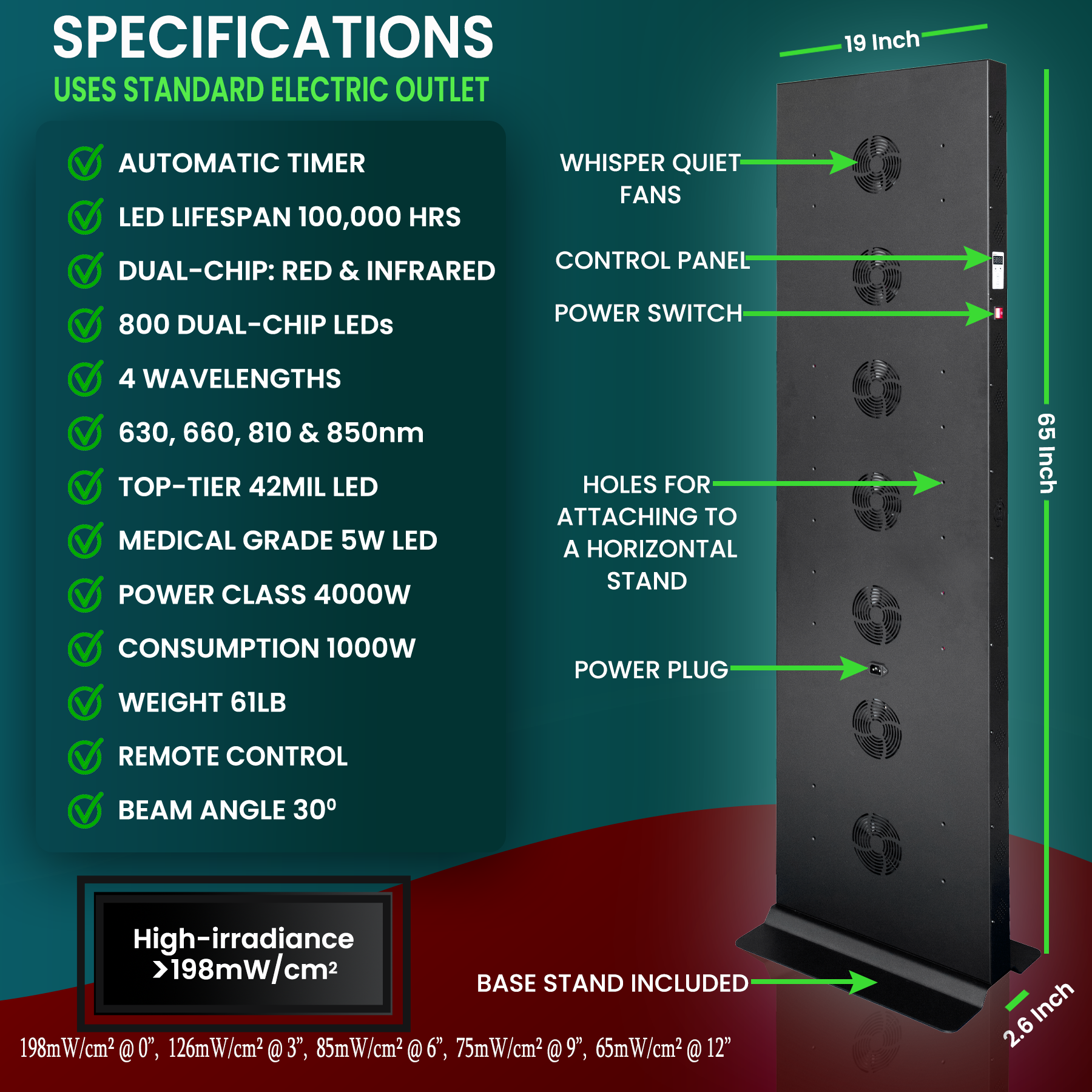CUTTING EDGE LED DEVICE: Discover the ultimate in LED Red-Light Therapy with our cutting-edge device. Utilizing state-of-the-art technology favored by professional athletes and highly recommended by today's leading doctors & therapists, our Full Body Panel is designed for versatile placement anywhere you desire, comes with a base stand. Engineered with Dual-Chip Medical Grade LEDs, 4 Wavelengths & Automatic Timer; it ensures high-irradiance, no flickering, providing consistent and effective therapy sessions. Remote control included. 800 top-tier 42Mil LEDs, 5W each, Power Class 4000W, Actual Power Consumption 1000W, Wavelengths: 630nm 660nm 810nm & 850nm. RED & Infrared lights can be turned on separately or together. High-irradiance >198mW/cm², Beam angle 30 degrees, No EMF. Size: 65"X19"X2.6"