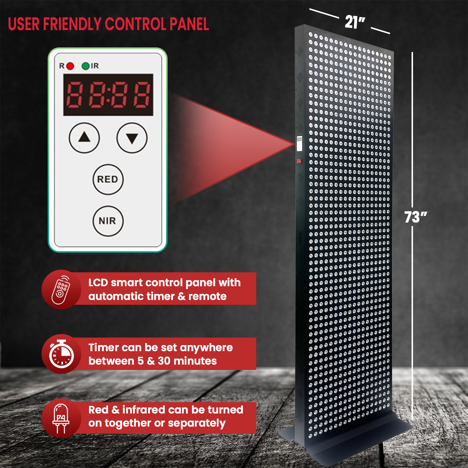 MANUAL & ACCESSORIES: Our package features everything you need for optimal use, including a top-notch LED panel (73" X 21" X 2.6"), a sleek remote control for effortless navigation, sunglasses, a user manual for easy setup and operation, and a sturdy base stand for secure placement. The LED panel is equipped with a built-in timer for precise session control, an LCD control panel, and integrated cooling fans to efficiently dissipate heat, ensuring prolonged device performance and user comfort.