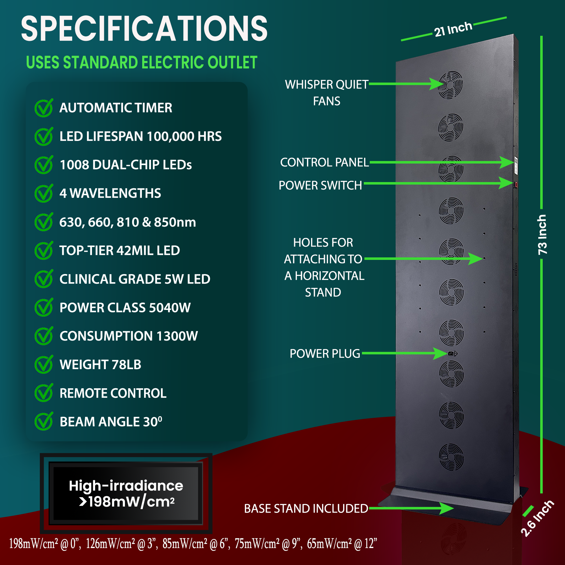 CUTTING EDGE LED DEVICE: Our LED Red-Light therapy utilizes the state-of-the-art technology used by Pro Athletes and recommended by today's leading Therapists. Our Full Body Panel can be placed anywhere. Base stand included. 1008 Clinical Grade LEDs, 5W each, Power Class 5040W, Actual Power Consumption 1300W, Dual-Chip, 4-Wavelengths: 630nm 660nm 810nm & 850nm, RED & IR lights can be turned on separately or together. High-irradiance >198mW/cm², Beam angle 30 degrees, No EMF, No Flickering. Size: 73"X21"X2.6"