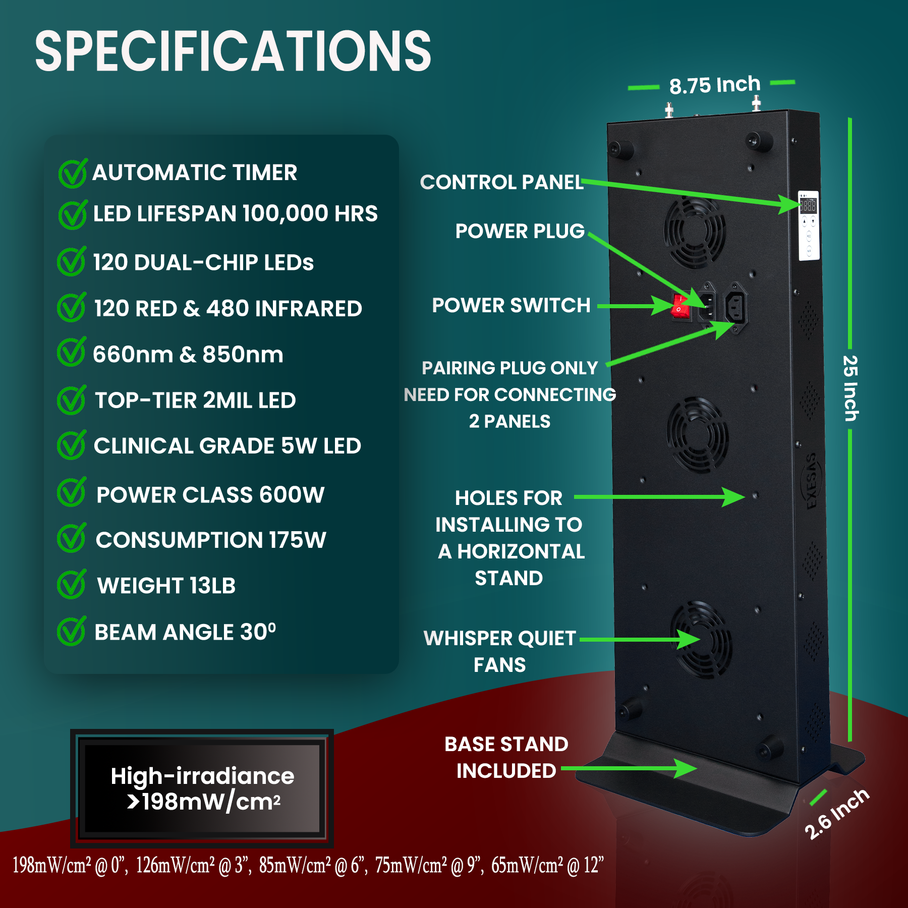BEST RED-LIGHT DEVICE: Our LED Red-Light therapy utilizes the state-of-the-art technology used by Pro Athletes and recommended by today's leading Therapists and Trainers. Our Full Body Therapy Panel which can be placed anywhere free-standing or can be hung easily. 120 Clinical Grade LEDs, 5-WATT each, total 600-WATT, Dual-Chip: 120 Red & 120 Infrared lights (twice the power of single-chip), Beam angle 30 degrees, NO Flickering, Irradiance >198mW/cm², Size: 25"X8.5"X2.6"