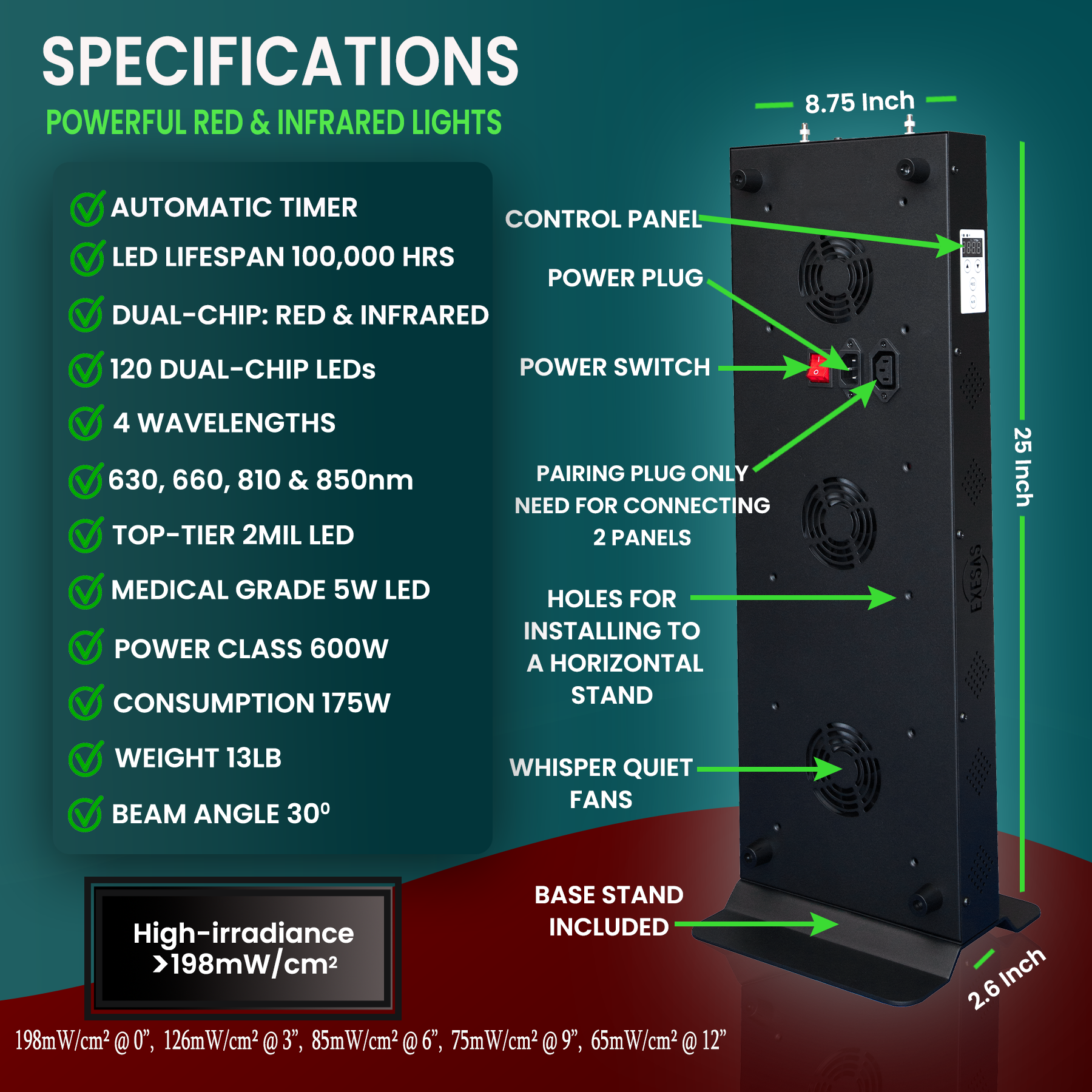 Discover the ultimate in LED Red-Light Therapy with our cutting-edge device. Utilizing state-of-the-art technology favored by professional athletes and highly recommended by today's leading doctors & therapists, our Full Body Panel is designed for versatile placement anywhere you desire, comes with a base stand. Engineered with Dual-Chip Medical Grade LEDs, 4 Wavelengths & Automatic Timer; it ensures high-irradiance, no flickering, providing consistent and effective therapy sessions. 120 top-tier 42Mil LEDs, 5W each, Power Class 600W, Actual Power Consumption 175W, Wavelengths: 630nm 660nm 810nm & 850nm. RED & Infrared lights can be turned on separately or together. High-irradiance >198mW/cm², Beam angle 30 degrees, No EMF. Size: 25"X8.5"X2.6"